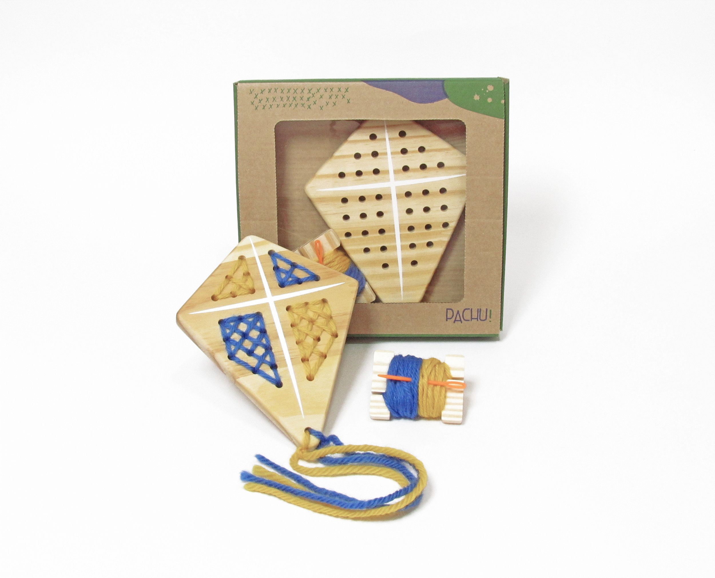 Este kit contém: 1 pç em madeira pinus, 1 agulha de plástico com ponta arredondada e lãs coloridas. Acompanha também folheto de instruções.