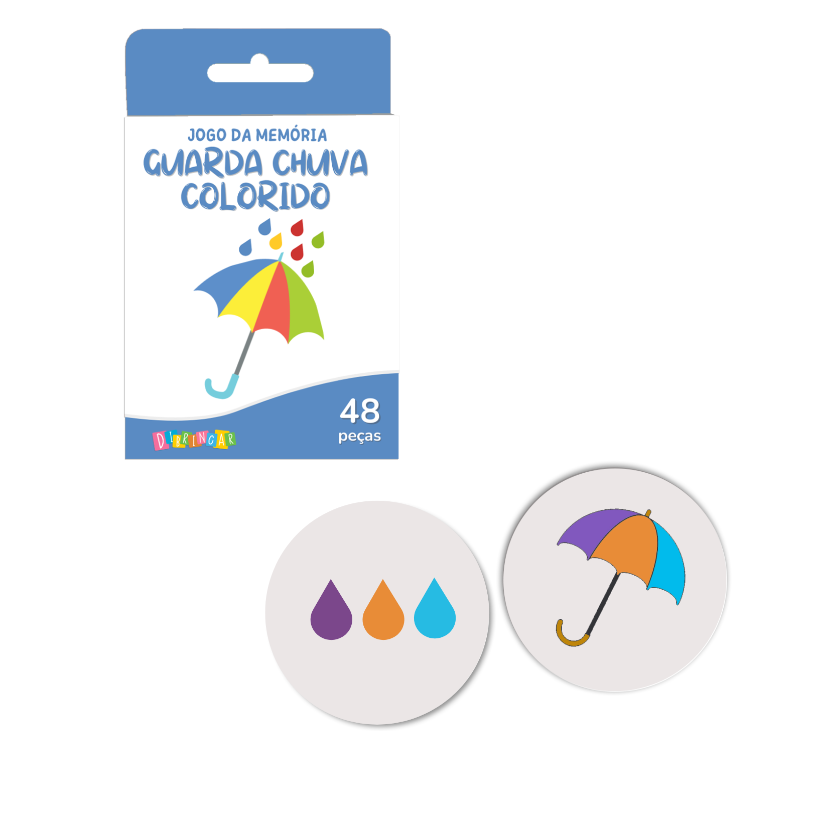 Jogo tradicional de memória, com cartas redondas e lindamente ilustradas com figuras de guarda-chuvas coloridos e gotinhas de chuva.